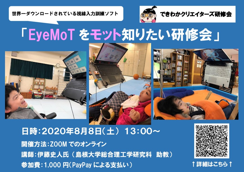 今回のできわかクリエイターズの研修会は、世界一ダウンロードされている視線入力訓練ソフト「EyeMoT」の開発者である伊藤史人氏をお招きして、「EyeMoT」の活用法や様々な子達の活用事例を紹介してもらいます。明日からの視線入力装置の活用がモット広がるきっかけになるはずです!
