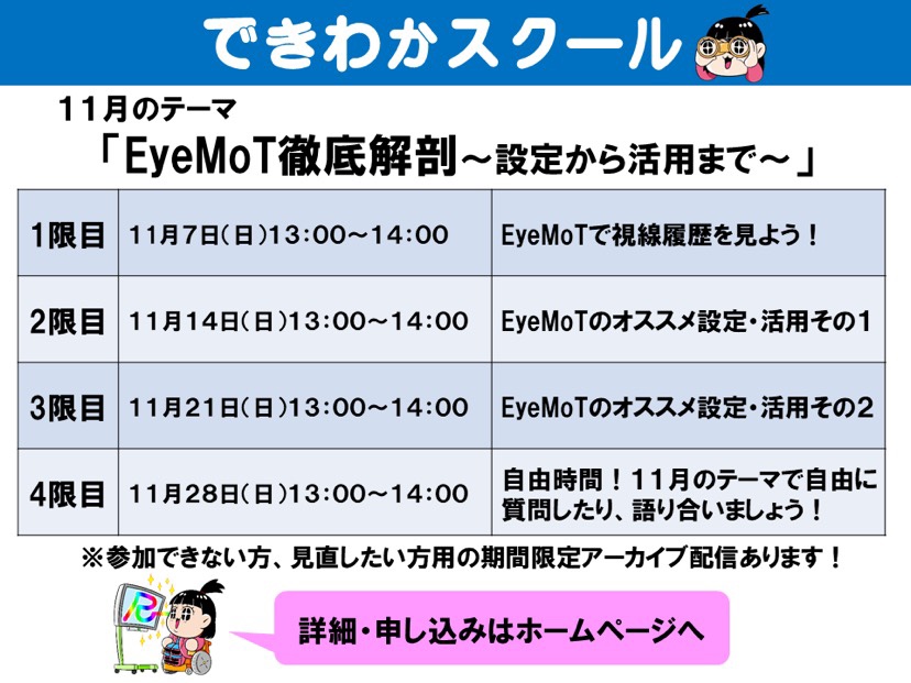 11月のテーマは「EyeMoT徹底解剖~設定から活用まで」です。EyeMoTのおすすめの設定方法は?EyeMoTの視線履歴の見方は?EyeMoTを深く知り、明日からの視線入力の活用に活かしましょう!