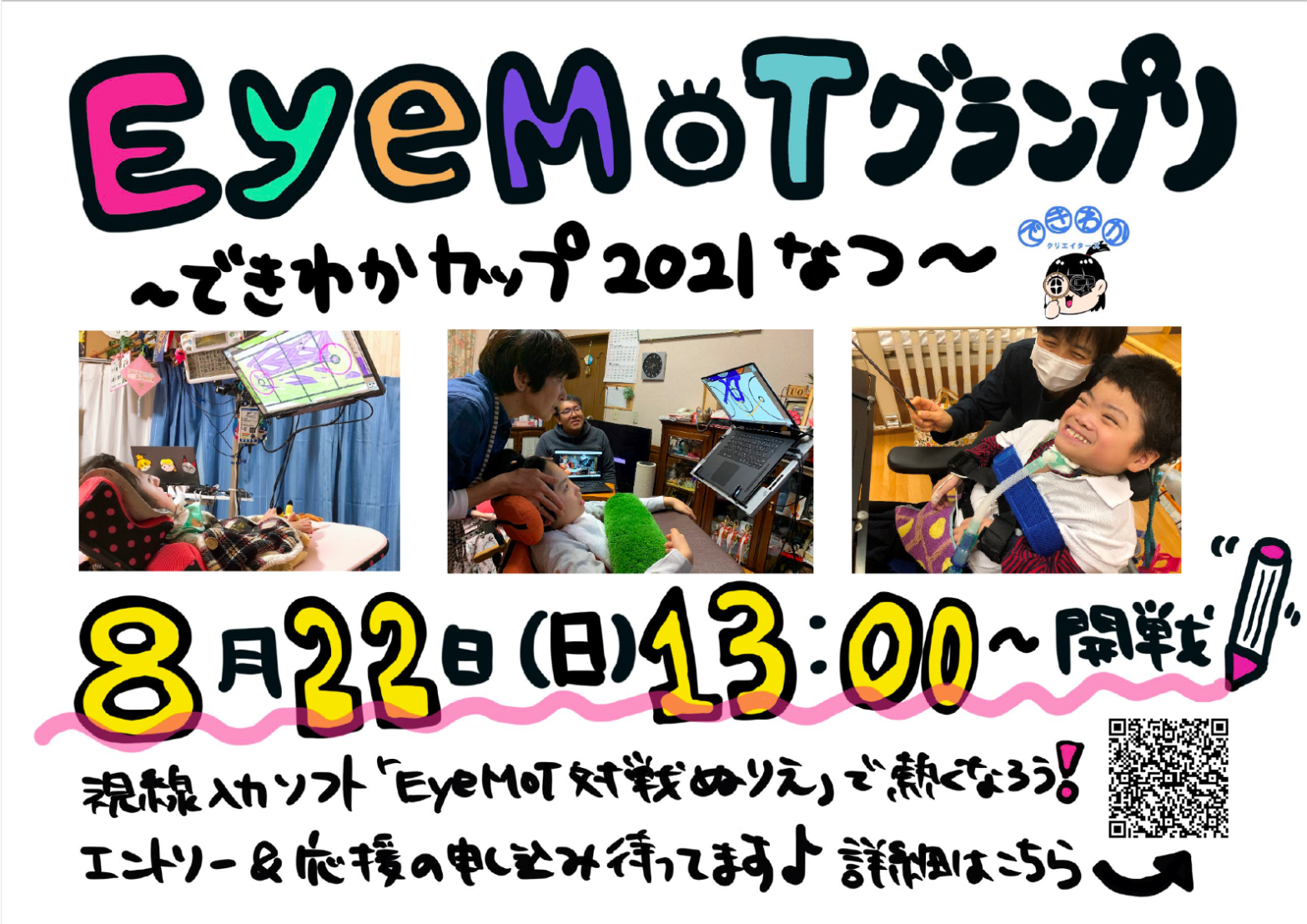 重度障害の子達も参加できるe-スポーツがEyeMoTグランプリです。島根大学で開発されている視線入力訓練用ゲーム「EyeMoT対戦ぬりえ」を使用し、世界中のプレイヤーとオンラインで繋がって対戦できます。みんなで一緒に楽し続きを読む “EyeMoTグランプリ~できわかカップ2021なつ~ 8/22”