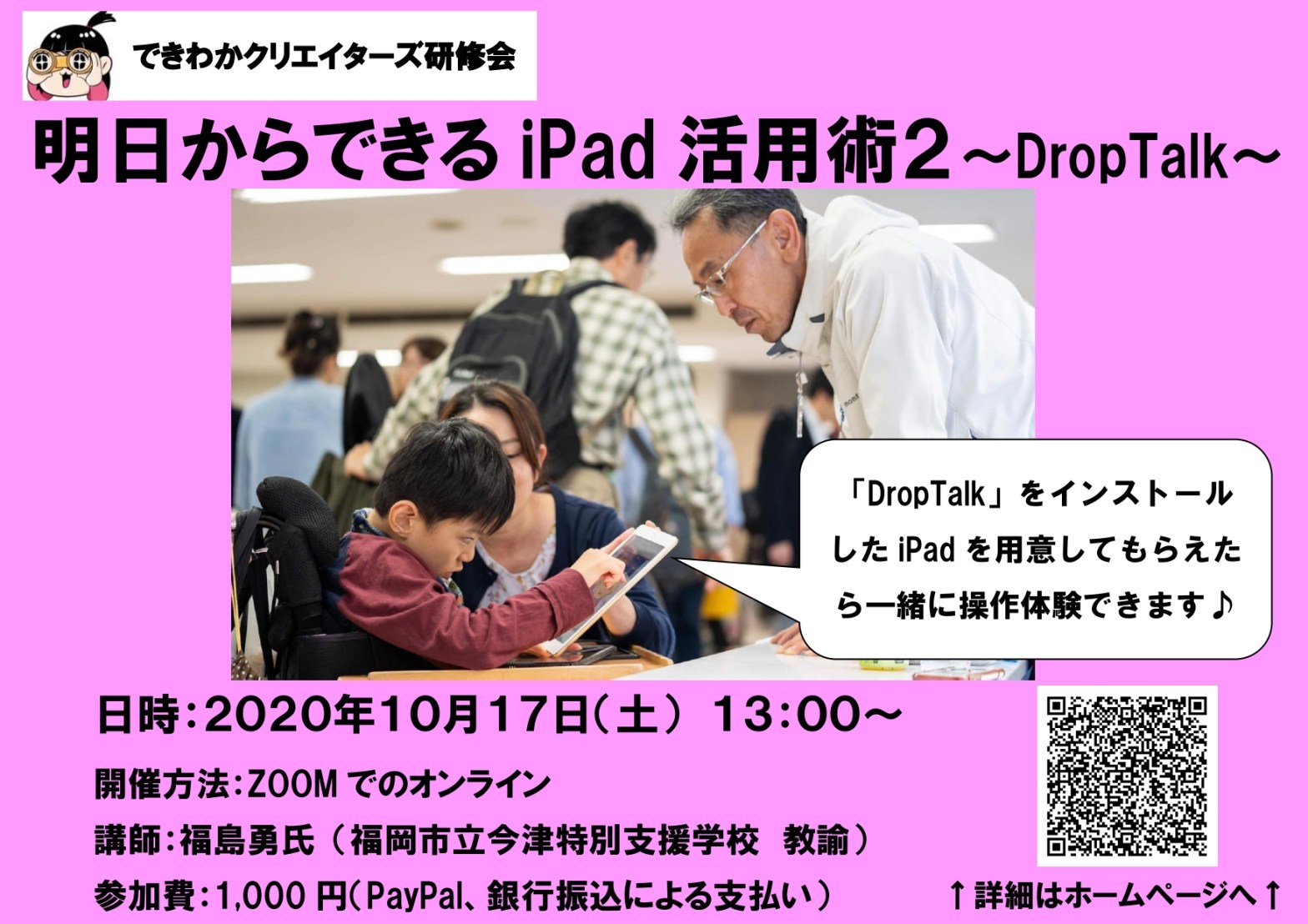 2020年8月22日(土)13:00開始 講師: 福岡市立今津特別支援学校 教諭 福島勇氏 ブログSam’s e-AT Lab Facebook 場所:zoom オンライン 参加費:1000円申し込み後にメールにて振込先続きを読む “「明日からできるiPad活用術」”