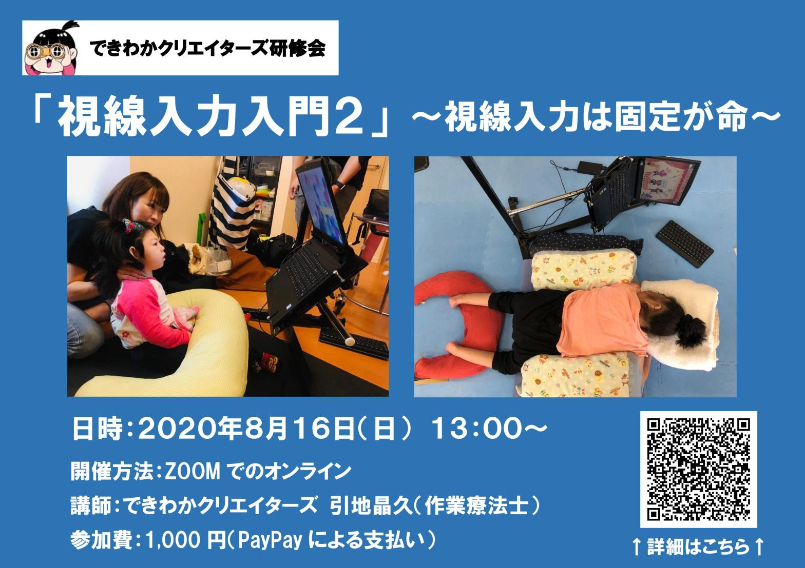 ~視線入力は(機器の)固定が命〜 2020年8月16日(日)13:00開始 講師:できわかクリエイターズ 引地晶久(作業療法士) 参加費 1000円申し込み後、2日以内にメールで振込先のPaypayをお送りいたします。 続きを読む “「視線入力入門2 」”