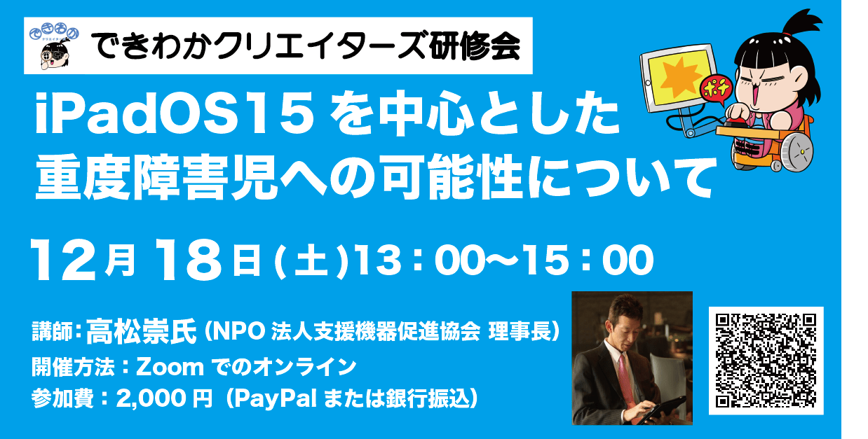 今回のできわか研修会は、高松崇氏をお招きし、iPad活用をテーマに開催します。iPadOSが15にバージョンアップした事で、これまでiPadの活用を諦めていた人にも新しい可能性が広がりました。 その話を中心にiPadの可続きを読む “12月18日「iPadOS15を中心とした、重度障害児への可能性について」”