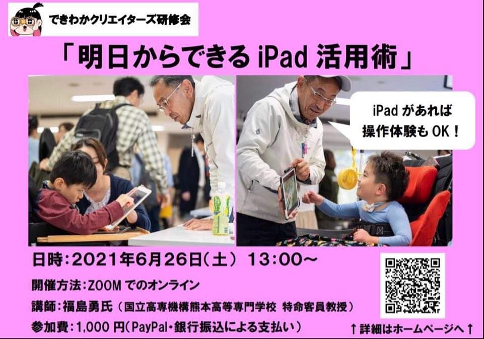 今回のオンライン研修会は、福島勇氏をお招きし、重度・重複障害の方もチャレンジできるiPad活用術をテーマに実施します。意思を伝える手段としてのアプリやiPadを便利に使うアクセシビリティ機能を紹介し、iPadをお持ちの方続きを読む “明日からできるiPad活用術”